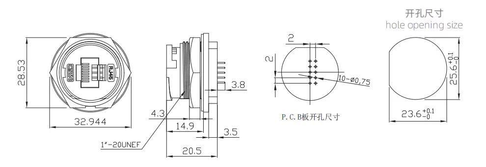 RJ45 여성 백 마운트 PCB 리셉터클 (스레드)