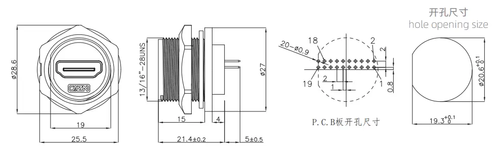 | HDMI 여성 백 마운트 PCB 리셉터클 (스레드) | HDMI 2K | E13T-FH2-PPF |