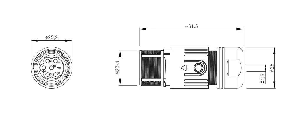 | M623 신호 직선 결합 여성 금속 조립 플러그 (Crimp) | M623-S7P-GCKP11 | M623-S7E-GCKP11 | 7 핀 | ||