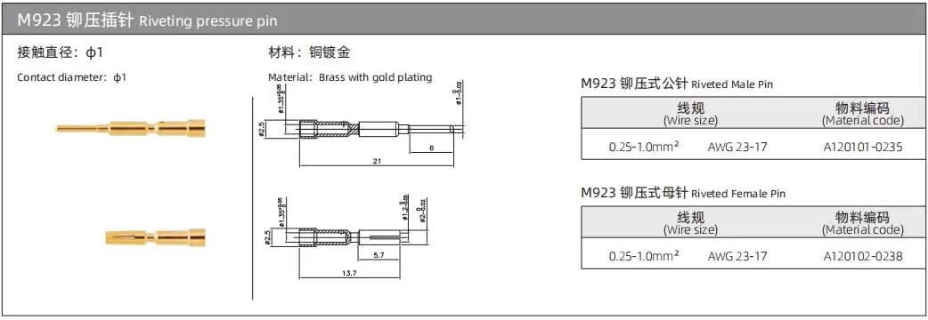 | M923 리벳 된 남성 핀 1mm | A120101-0235 | 0.25-1.0mm² awg : 23-17 | ||