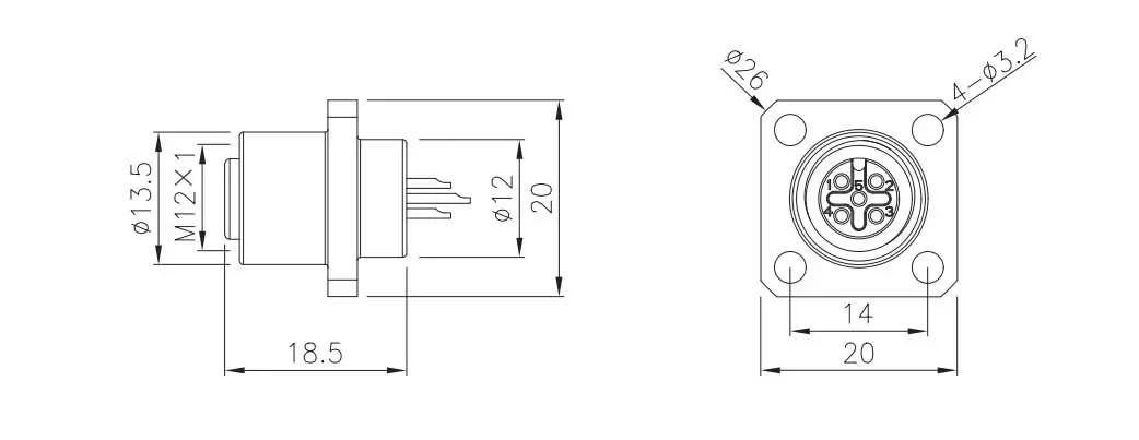 | M12 Square Flange 암 소켓 (Solder, Screw14*14) | M12-S4D-GWH | 4d | ||