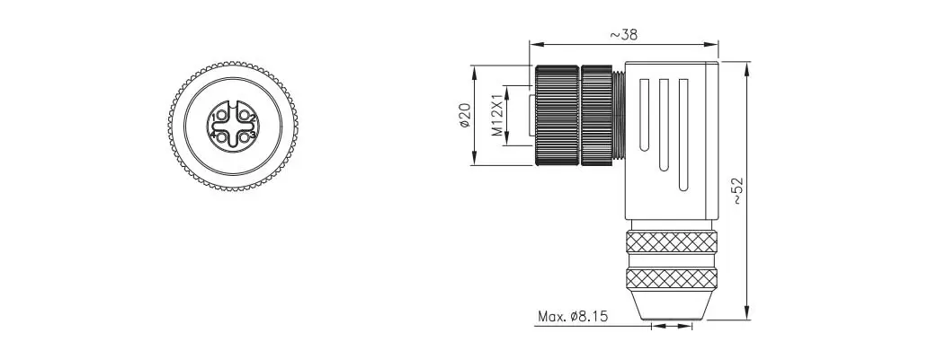| M12 각진 암컷 금속 조립 플러그 | M12-S8A-GLDP7-N-TT | M12-S8A-GLDP9-N-TT | 8a |