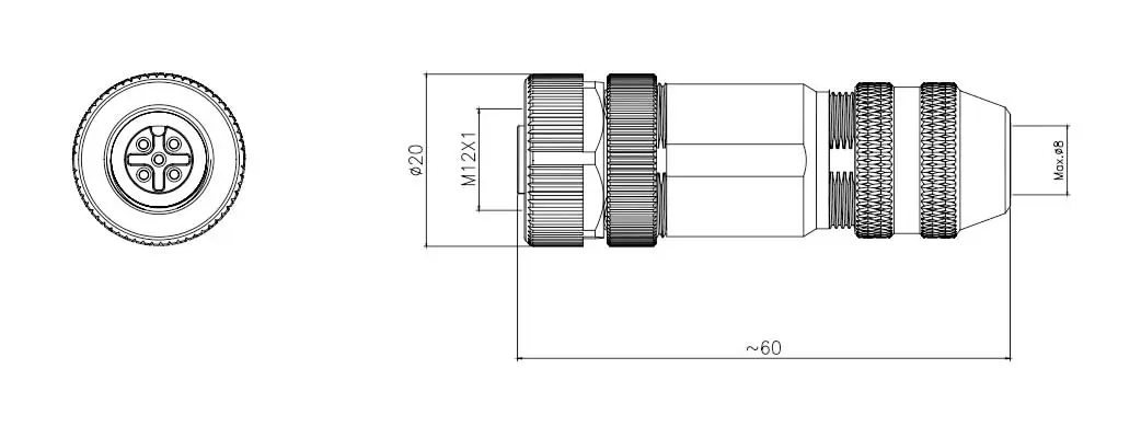 | M12 스트레이트 여성 금속 조립 플러그 (나사) | M12-S8A-Glap7 | M12-S8A-Glap9 | 8a |