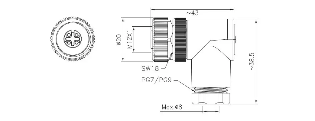 | 각진 암컷 플라스틱 조립 플러그 | M12-S8A-PLDP7 | M12-S8A-PLDP9 | 8a |