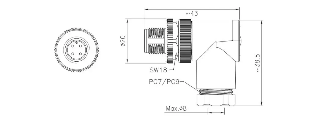 | 각진 수컷 플라스틱 조립 플러그 | M12-P8A-PLDP7 | M12-P8A-PLDP9 | 8a |