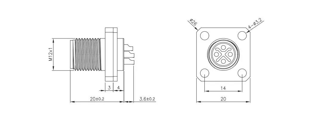 | M12 Square Flange 수컷 소켓 (전력 유형, 솔더, 14*14) | M12-P4L-GWH-NP | 4L |