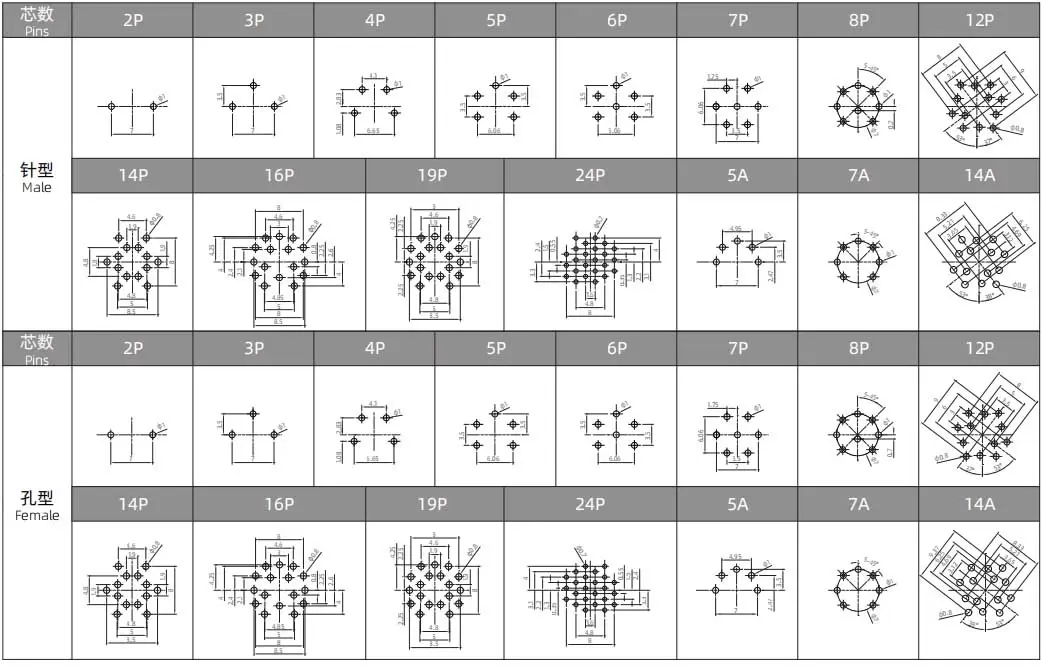 | M16 남성 백 마운트 소켓 (PCB) | M16-P14-GPFM18 | 14 핀 | ||