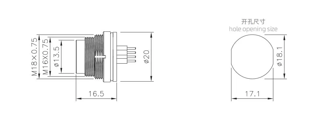 | M16 남성 백 마운트 소켓 (PCB) | M16-P2-GPFM18 | 2 핀 | ||