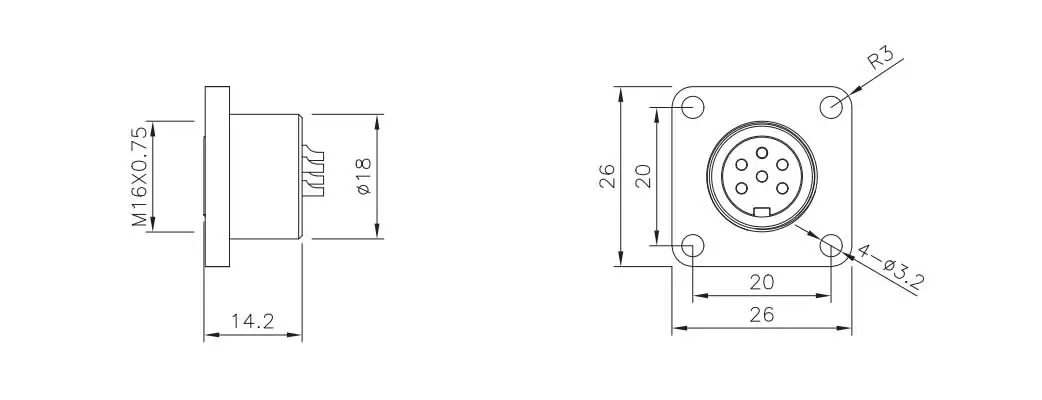 M16 수컷 사각형 소켓 (솔더 타입, 마운트 홀 20*20)