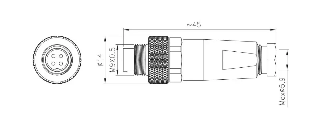 | M9 각진 암컷 금속 플러그 (솔더) | M9-S4-GWD05 | 4 핀 A- 코드 | ||