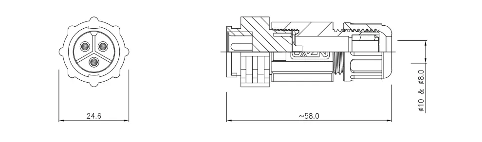 | E13 스트레이트 남성 조립 플러그 ( Bayonet ) | 125+30V | 15+2A | E13B-P8C- PWK08 | 8c |