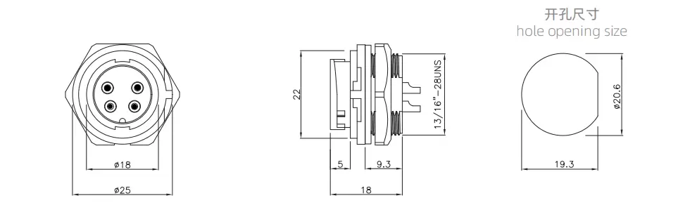 | E13 전면 마운트 남성 리셉터클 ( Bayonet ) | 300V | 20A | E13B-P4B-PWB | 4B |